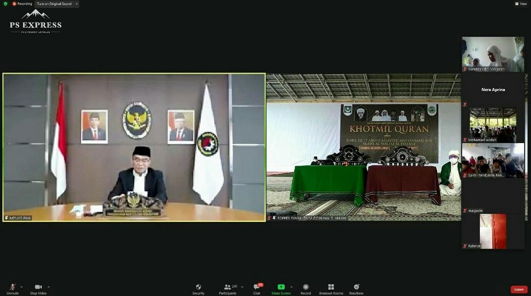 Sebelumnya, Ketua Umum PBNW Syaikhuna Tuan Guru Bajang KH M Zainuddin Atasni, menyampaikan ucapakan terima kasih kepada Menko. PMK yang bersedia menghadiri acara pembacaan Al-Quran oleh 10 ribu peserta dari seluruh Indonesia via zoom dalam rangka peringatan Nuzulul Quran di Pontren Syaikh Zainuddin NW Anjani dan daring.