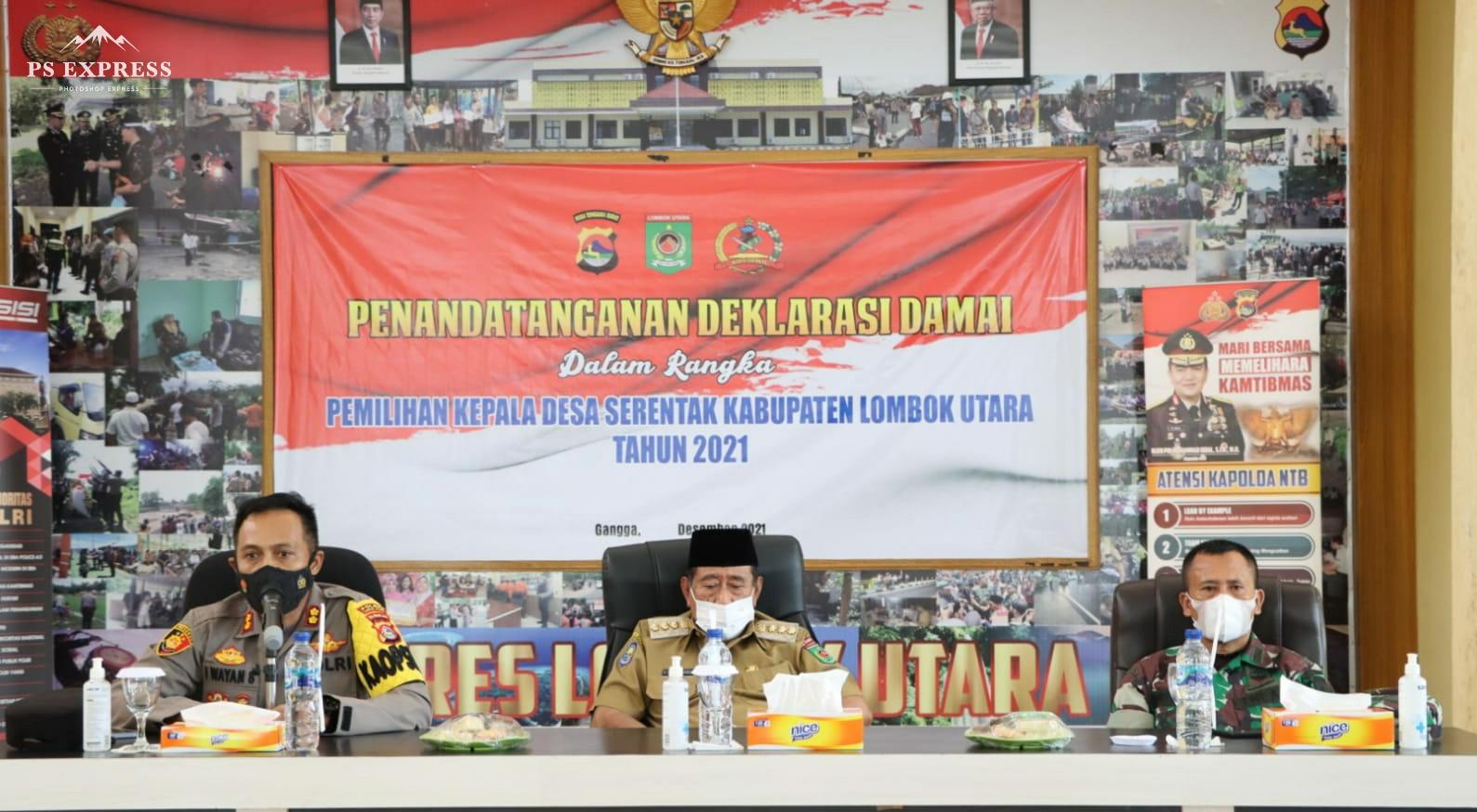 Lombok Utara, MediaMe.Id. Jelang pelaksanaan Pemilihan Kepala Desa (Pilkades) serentak yang dilaksanakan pada 21 Desember tahun 2021, Pemerintah daerah Kabupaten Lombok Utara dan Polres Lombok Utara ( Lotara ) gelar deklarasi damai di Aula Sarja Arya Racana ( SAR ) Mapolres Lotara pada Selasa (7/12)