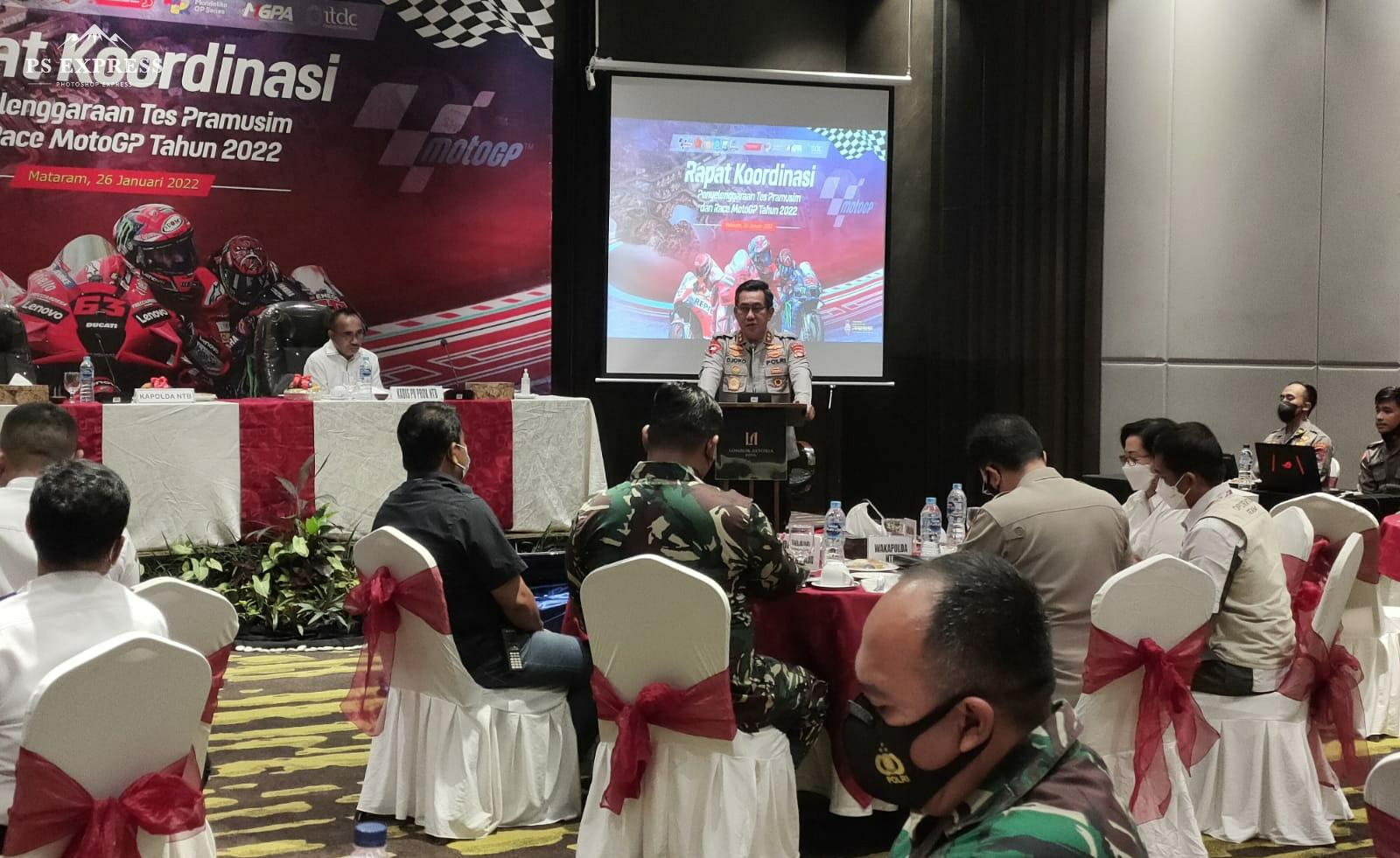 Mataram, MediaMe.Id. Kepolisian Daerah Nusa Tenggara Barat (Polda NTB) menggelar rapat koordinasi (Rakor) bersama lintas sektoral persiapan penyelenggaraan tes pra musim dan Race MotoGP Mandalika.