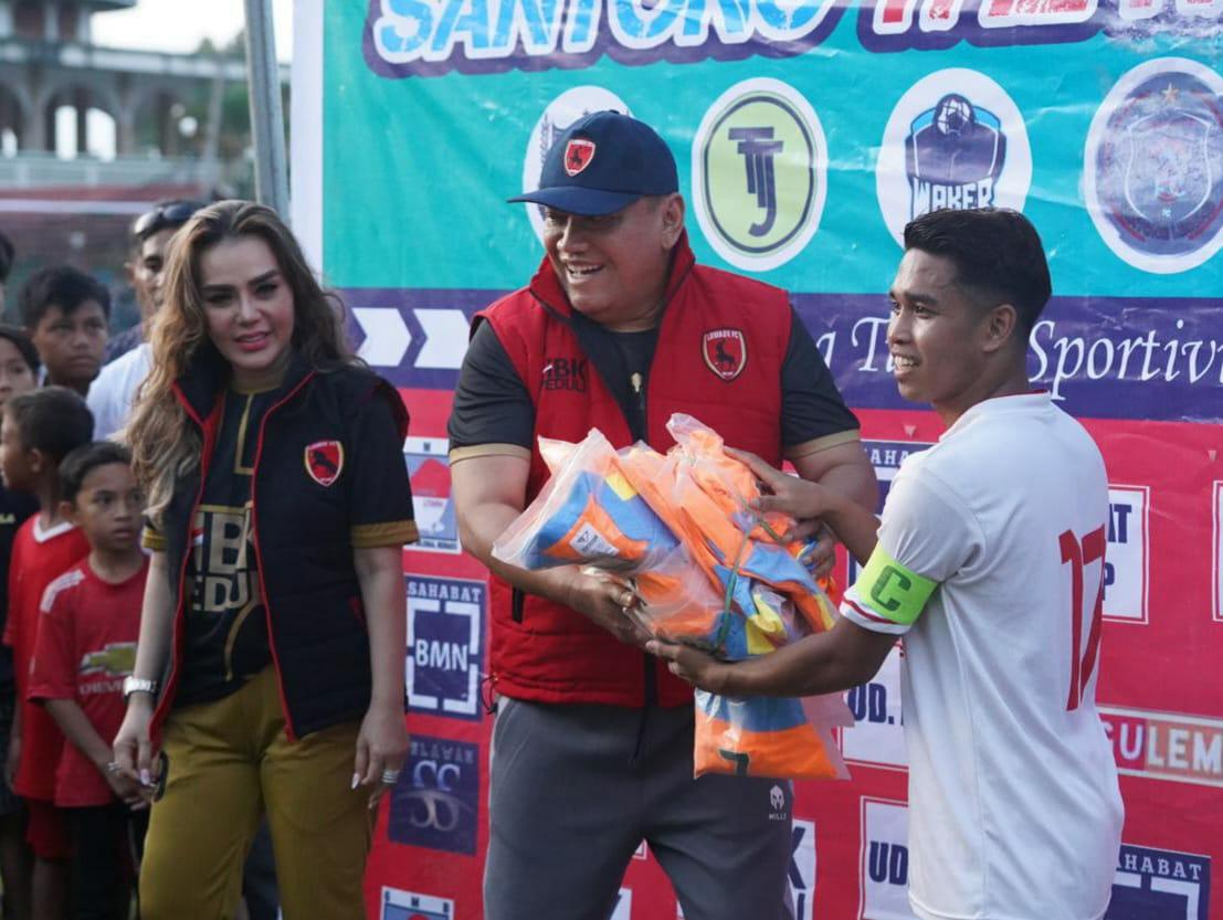 Di akhir pertandingan, selaku Ketua Yayasan HBK PEDULI, kemudian HBK memberikan bantuan bola sepak dan 2 sets jersey sepakbola untuk memberikan semangat para pemain Santong FC. (ME.red)
