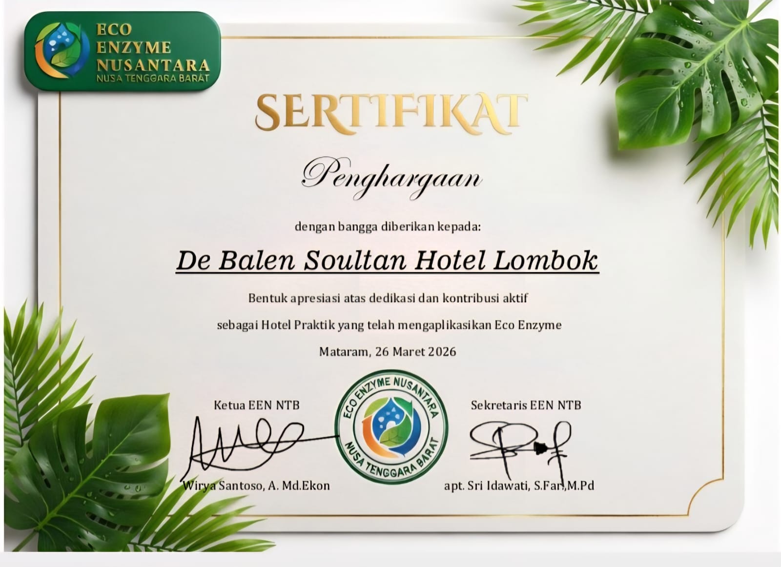 Lombok Tengah, mediame.id – De Balen Soultan Lombok sebagai hotel praktik baru-baru ini telah menerima penghargaan atas komitmen dan praktik nyata mereka dalam mengelola serta memanfaatkan sampah (waste management) khususnya sampah organik untuk mendukung keberlanjutan lingkungan. Penghargaan diberikan oleh Eco Enzyme Nusantara NTB pada Kamis (26/03). Penghargaan diberikan secara online.